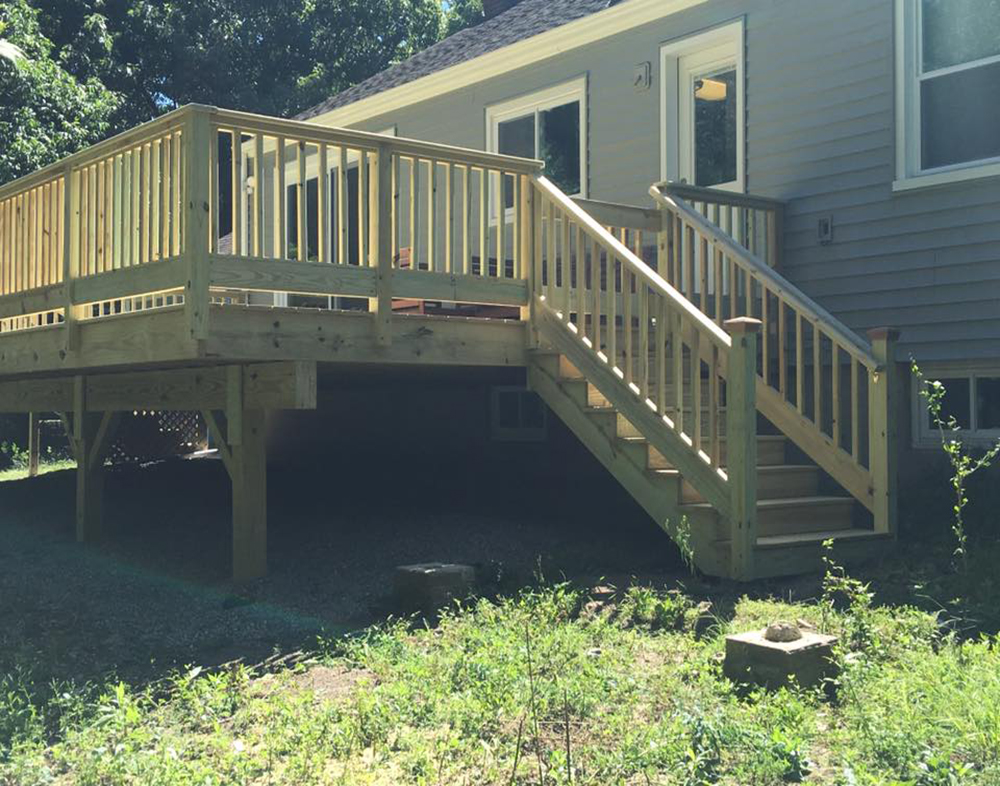 This Natural Cedar Deck is ready for finishing, The deck took about 3 days from the first hole dug to compeltion. This deck was built 2016 and our client is exctatic with the result.